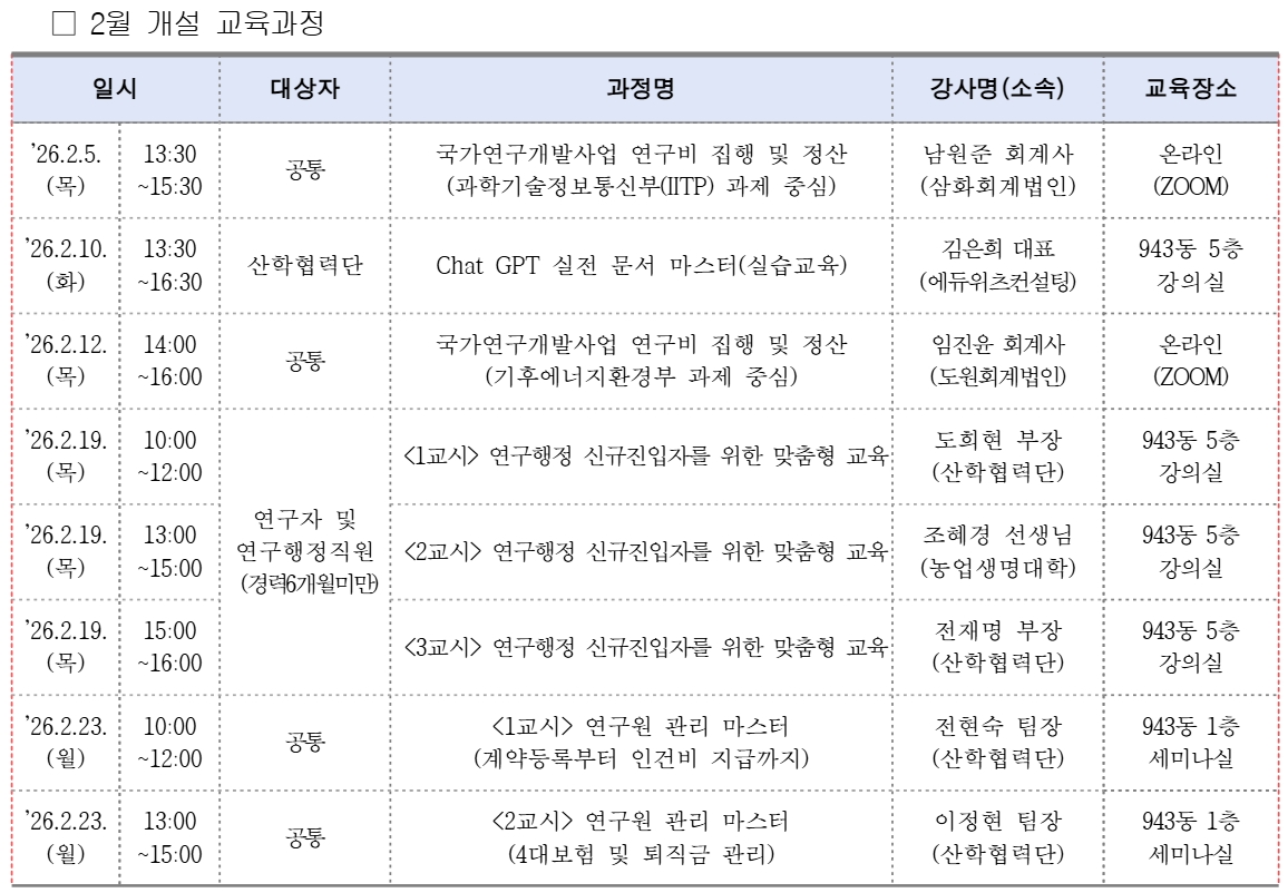 2026년 2월 산학협력단 R&D교육센터 교육시행 안내