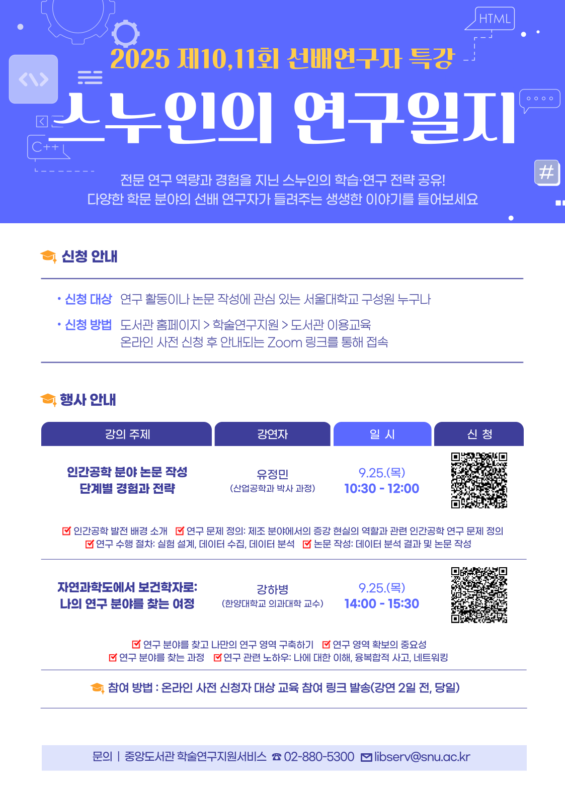 제 10,11회 선배 연구자 특강「스누인의 연구일지」개최 안내(9/25)