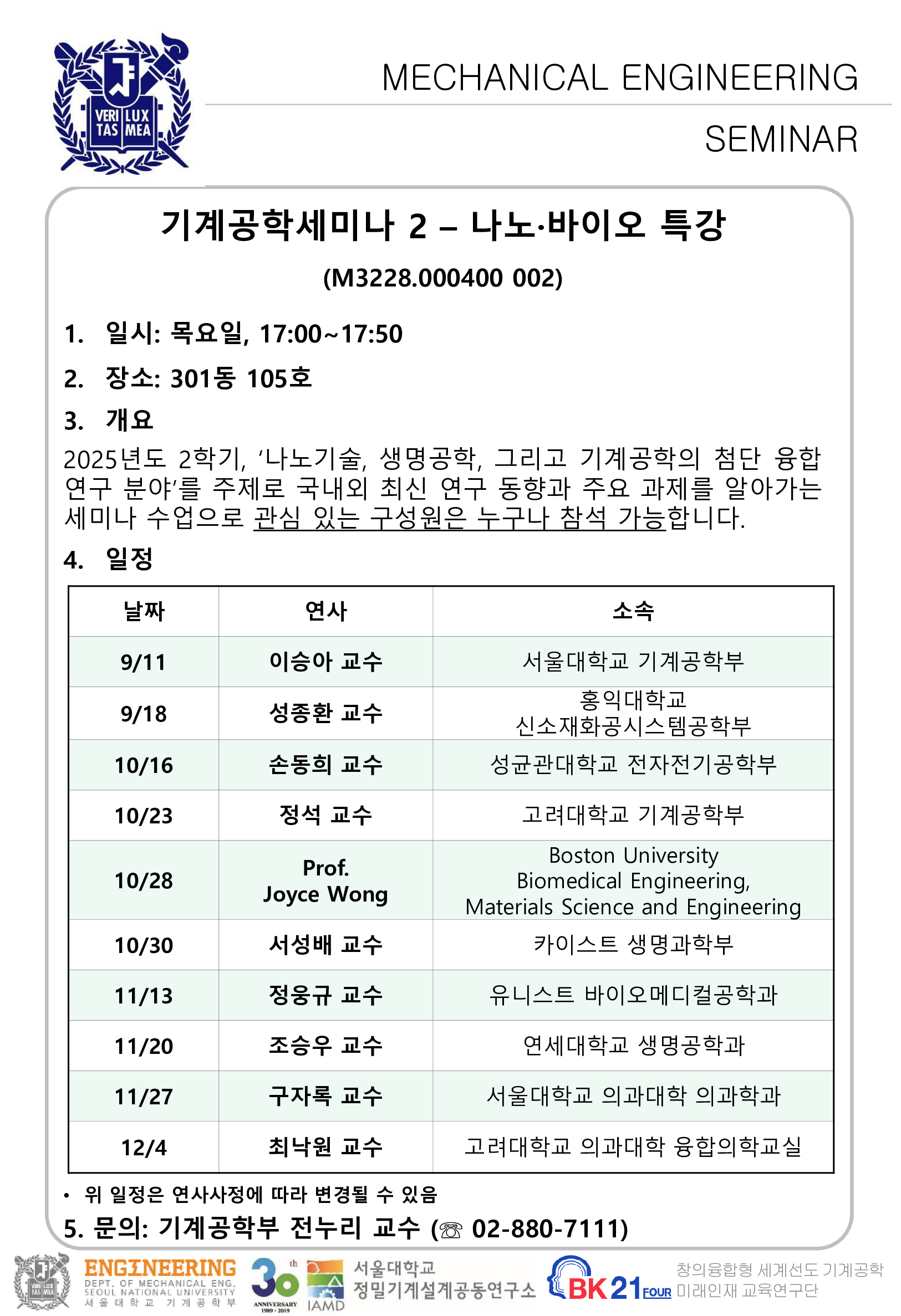 [2025-2 ME Seminar] Series on "나노-바이오 특강" 전체 일정
