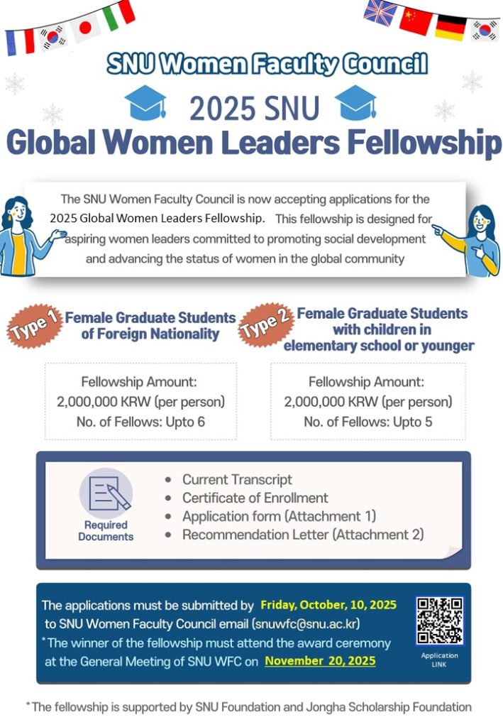 F. The winner of the fellowship must attend the award ceremony at the General Meeting of SNU WFC on November 20, 2025.*The fellowship is supported by SNU Foundation and Jongha Scholarship Foundation.