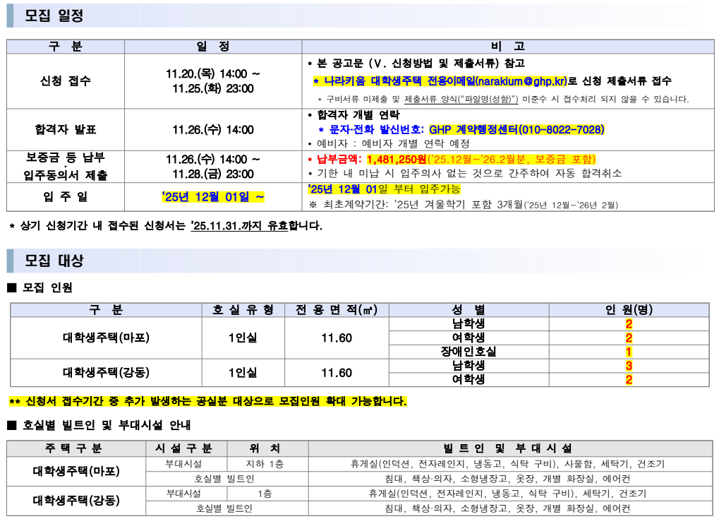 「나라키움 대학생주택」 2025년 2학기 추가모집(12월 입주) 안내