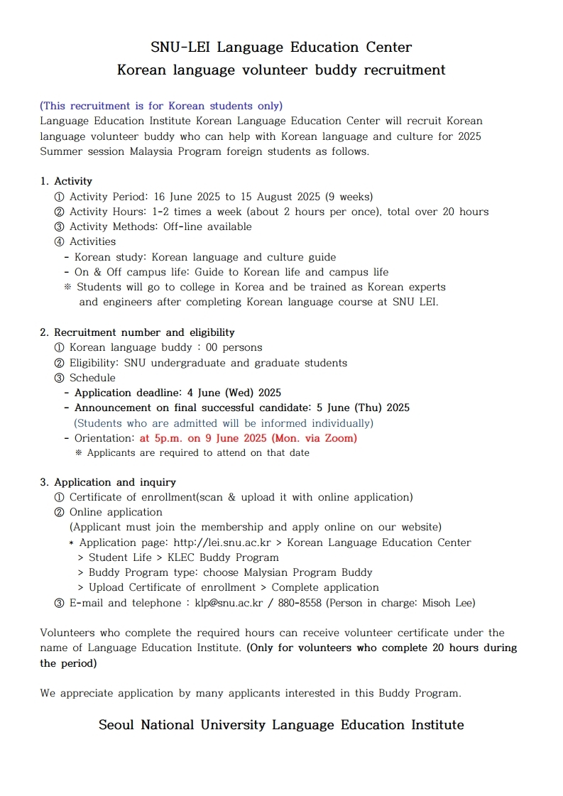 [SNU Language Education Institute] Buddy Recruitment Notice